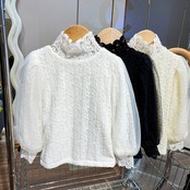 レースの上品なデザインが魅力の長袖トップスです。子どもたちにも着やすいサイズ展開で、品質も安心してお使いいただけます。レースのディテールが、女の子らしさを引き立てますよ。シンプルながらも華やかな一枚で、普段のコーディネートにアクセントを加えてくれます。
