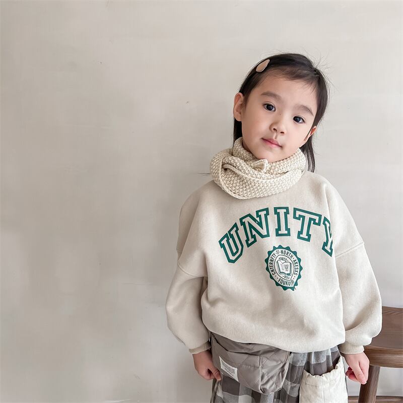 暖かい裏ボア素材で、可愛らしいカレッジロゴがポイントのスウェットです。季節を問わず、お子様のカジュアルなスタイリングにぴったりの一着です。しっかりとした作りで、お子様が快適に過ごせるデザインになっています。