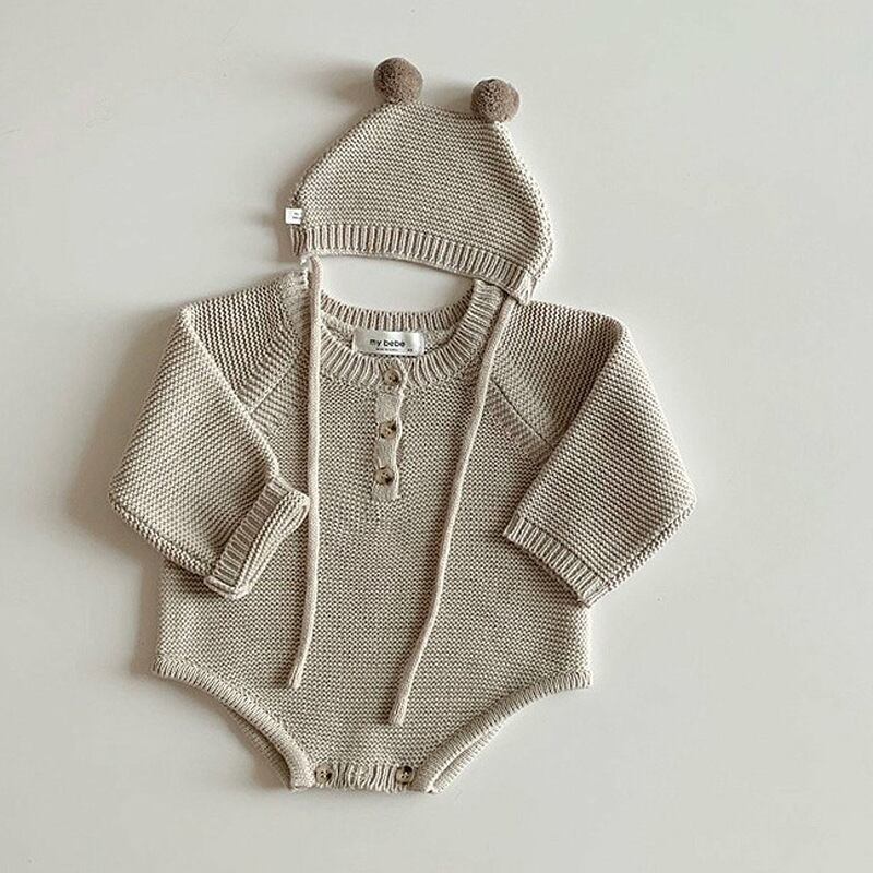 可愛らしいベビーニットジャンプスーツと帽子のセットです。