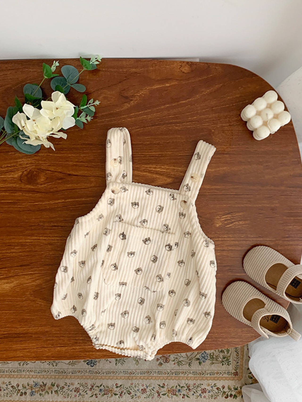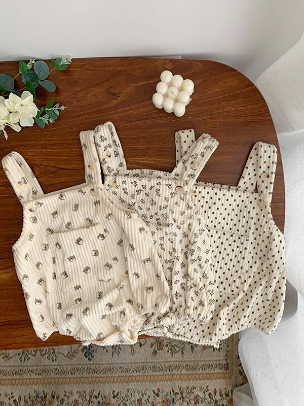 総柄×コーデュロイ素材がポップな印象で可愛いロンパース◎